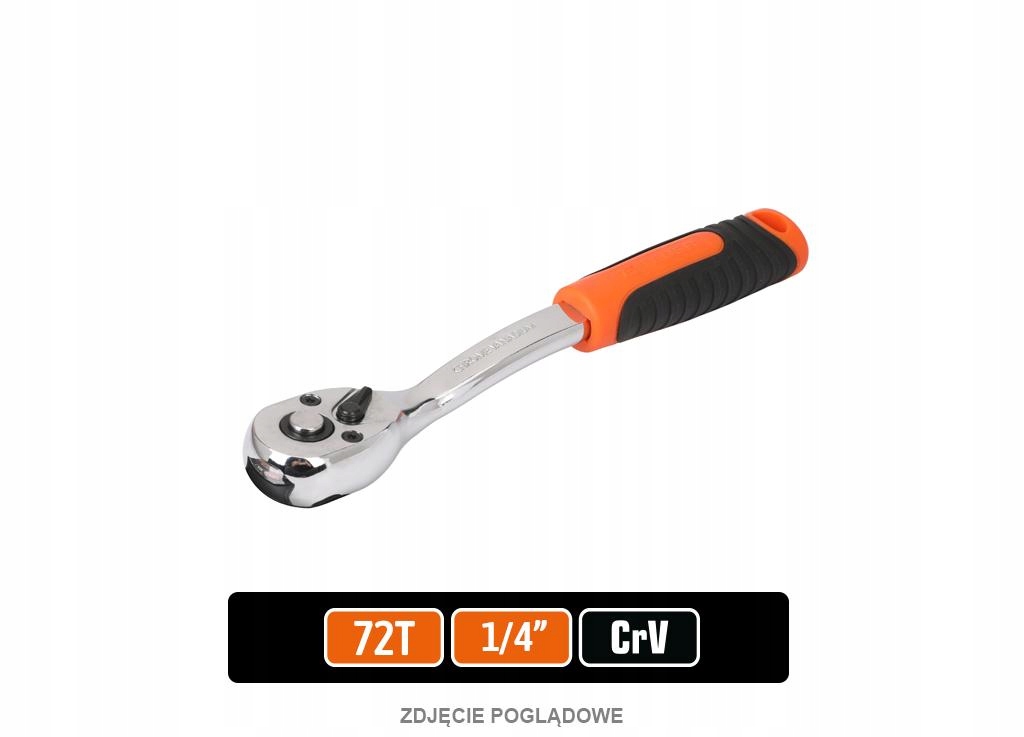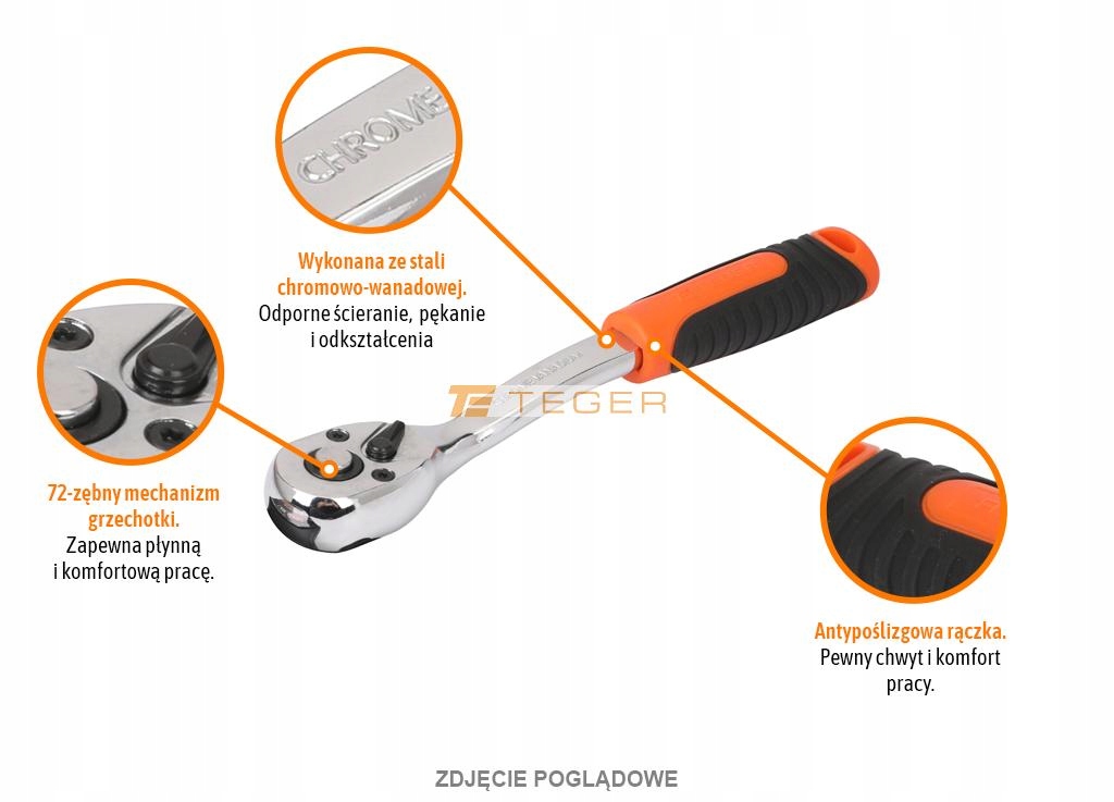 Grzechotka 1/4" 72T / TEGER przeznaczona do odkręcania i dokręcania śrub przy użyciu klucza nasadowego. Wykonana ze stopu stali chromowo-wanadowej CRV, wytrzymałej na naprężenie statyczne i kinetyczne. Wysoka jakość wykonania, rękojeść wykonana z antypoślizgowego tworzywa, unikalna, polerowana powłoka na powierzchni klucza znacząco zwiększa komfort pracy oraz pozwala na utrzymanie narzędzi w czystości a odgięty kształt zapewnia dostęp do trudno dostępnych miejsc. Grzechotka posiada mechanizm zapadkowy z 72 zębami oraz system blokujący klucz nasadowy wraz przyciskiem zwalniającym blokadę. Zalety klucza: bardzo mocna i wytrzymała konstrukcja, wyprofilowany uchwyt pokryty antypoślizgową gumą, precyzyjny mechanizm zapadkowy.
