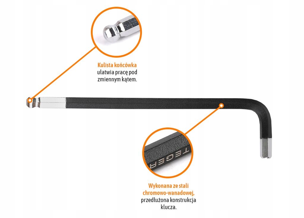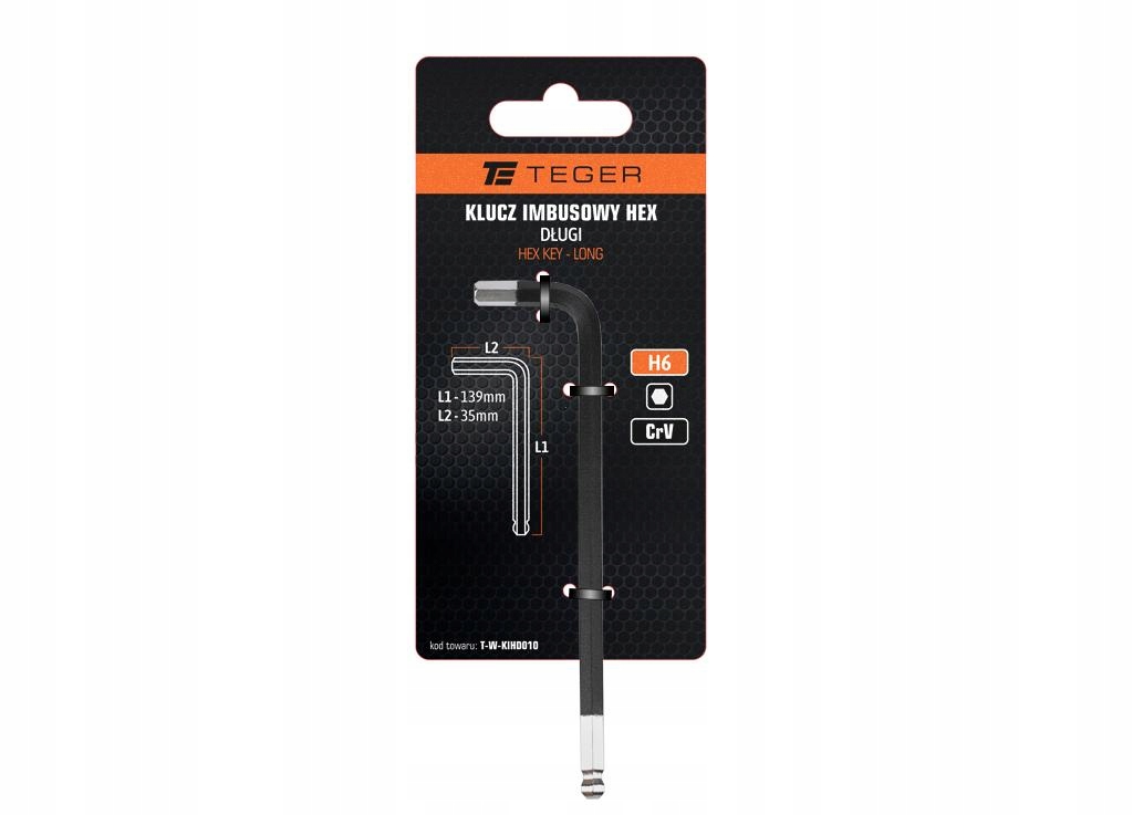 Klucz imbusowy HEX H6 - DŁUGI / TEGER przeznaczony do odkręcania i dokręcania śrub z gniazdami typu HEX. Wytrzymały dobrze wyprofilowany, sześciokątny długi klucz imbusowy z kulistą końcówką umożliwia pracę pod kontem nawet w trudno dostępnych miejscach. Wykonany z najwyższej jakości stali chromowo-wanadowej CRV wytrzymałej na naprężenie statyczne i kinetyczne. Wysoka jakość wykonania, unikalna, czarna powłoka na powierzchni klucza znacząco zwiększa komfort pracy oraz pozwala na utrzymanie narzędzi w czystości.