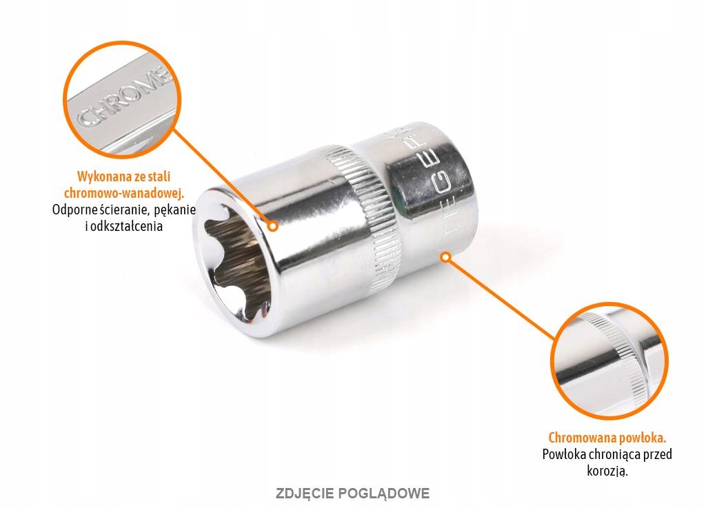 Klucz nasadowy 1/2" TORX E20 / TEGER przeznaczony do odkręcania i dokręcania śrub i nakrętek typu TORX. Wykonany ze stopu stali chromowo-wanadowej CRV, wytrzymałej na naprężenie statyczne i kinetyczne. Wysoka jakość wykonania, trwałość i niezawodność w każdych warunkach, unikalna, polerowana powłoka na powierzchni klucza znacząco zwiększa komfort pracy oraz pozwala na utrzymanie narzędzi w czystości.