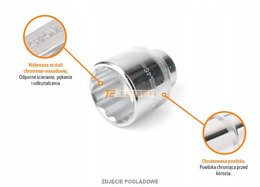 Klucz nasadowy 3/4" dwunastokątny 41 mm / TEGER przeznaczony do odkręcania i dokręcania śrub. Wykonany ze stopu stali chromowo-wanadowej CRV, wytrzymałej na naprężenie statyczne i kinetyczne. Wysoka jakość wykonania, unikalna, polerowana powłoka na powierzchni klucza znacząco zwiększa komfort pracy oraz pozwala na utrzymanie narzędzi w czystości. Dwunastokątny kształt umożliwia mniejszy skok, co ułatwia pracę w trudno dostępnych miejscach a zaokrąglone ścianki wewnątrz nasadki eliminują bezpośrednią styczność ze śrubą zapobiegając jej szybkiemu zużyciu, co zapewnia trwałość i niezawodność w każdych warunkach.