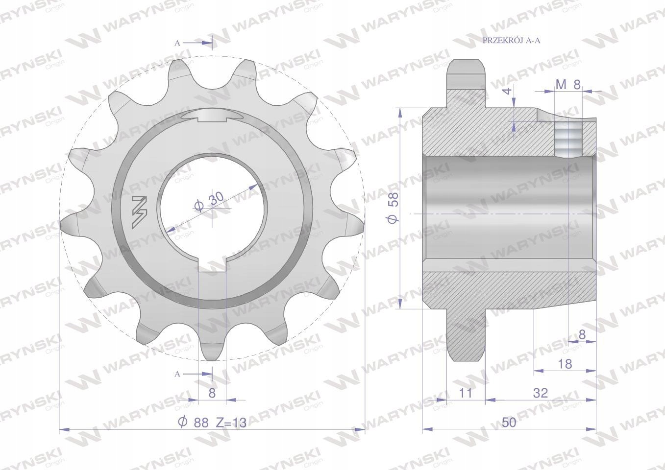 'Koło łańcuchowe stalowe hartowane Z-13 3/4" Q30 z piastą tuleją Rozrzutnik 2219060080 WARYŃSKI.