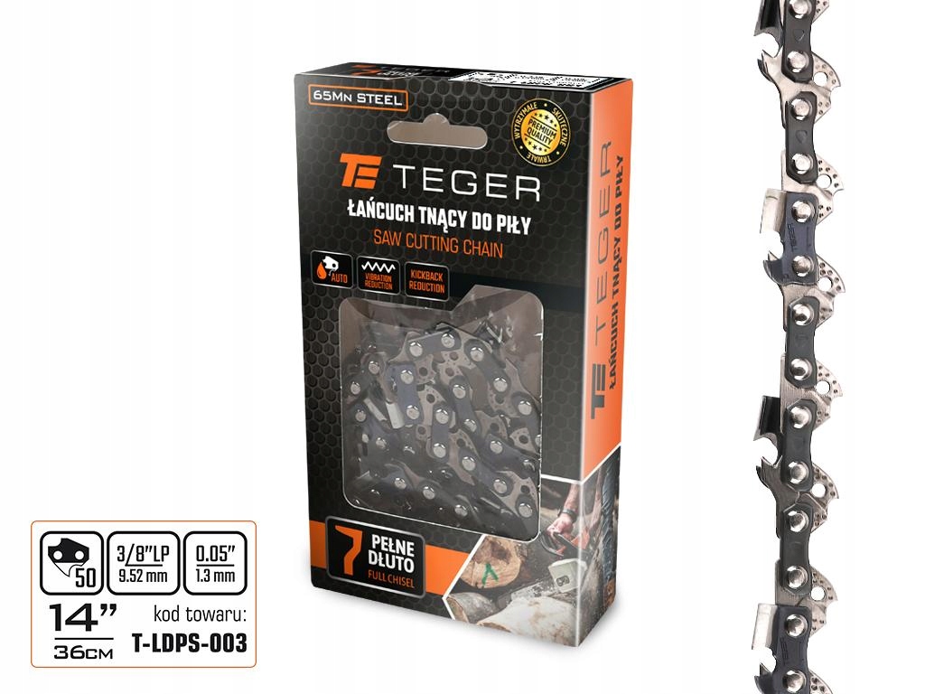 Łańcuch tnący do piły 14" (36 cm) / 3/8" 1,3mm 50 og. /PEŁNE DŁUTO/ TEGER przeznaczony do pił łańcuchowych, stosowany zarówno w profesjonalnym leśnictwie, jak i pracach ogrodniczych oraz przydomowych. Dzięki zastosowaniu pełnego dłuta, łańcuch zapewnia agresywne i precyzyjne cięcie, co sprawia, że jest szczególnie polecany do cięcia twardego drewna oraz intensywnej eksploatacji. Wykonany ze stali manganowej 65Mn, która zapewnia podwyższoną wytrzymałość na zrywanie, przez co wydłuża żywotność łańcucha. Dzięki automatycznemu systemowi smarowania, olej rozprowadzany jest równomiernie po całej długość prowadnicy. Powoduje to zmniejszenie oporów tarcia, redukując nagrzewanie się prowadnicy i wydłużając żywotność całego układu tnącego. Przeznaczony do prowadnicy TEGER: T-PDPS-003G. Zgodny z prowadnicami innych marek: 14”|9T|50|3/8”LP|0.05” (Indeks zestawu: T-ZTDPS-003G-SET TEGER)