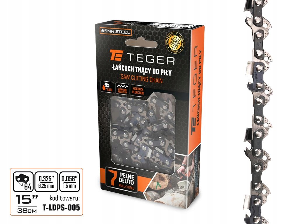 Łańcuch tnący do piły 15" (38 cm) / 0,325" 1,5mm 64 og. /PEŁNE DŁUTO/ TEGER przeznaczony do pił łańcuchowych, stosowany zarówno w profesjonalnym leśnictwie, jak i pracach ogrodniczych oraz przydomowych. Dzięki zastosowaniu pełnego dłuta, łańcuch zapewnia agresywne i precyzyjne cięcie, co sprawia, że jest szczególnie polecany do cięcia twardego drewna oraz intensywnej eksploatacji. Wykonany ze stali manganowej 65Mn, która zapewnia podwyższoną wytrzymałość na zrywanie, przez co wydłuża żywotność łańcucha. Dzięki automatycznemu systemowi smarowania, olej rozprowadzany jest równomiernie po całej długość prowadnicy. Powoduje to zmniejszenie oporów tarcia, redukując nagrzewanie się prowadnicy i wydłużając żywotność całego układu tnącego. Przeznaczony do prowadnicy TEGER: T-PDPS-005U. Zgodny z prowadnicami innych marek: 15”|12T|64|0.325“|0.058” (Indeks zestawu: T-ZTDPS-005U-SET TEGER)