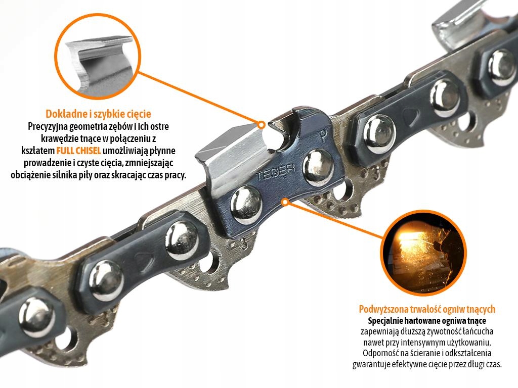 Narzędzia TEGER nadają się dla każdego majsterkowicza jak i profesjonalisty. Łańcuch tnący TEGER przeznaczony jest dla użytkowników którzy oczekują maksymalnej wydajności cięcia. Doskonale sprawdza się w ciężkich i profesjonalnych warunkach gdzie liczy się szybkość oraz precyzja ciecia. Należy pamiętać że każdy łańcuch wymaga regularnej konserwacji oraz ostrzenia co wydłuża jego żywotność.