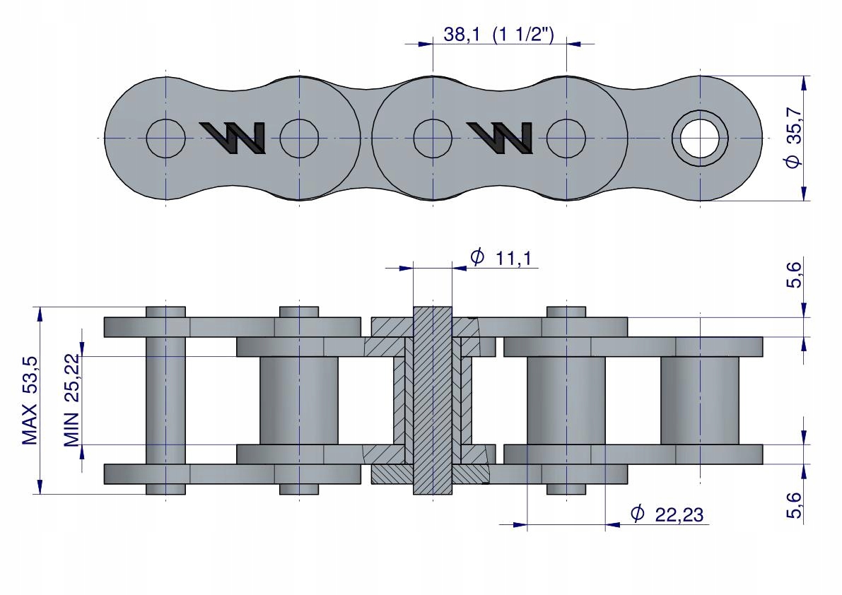 Łańcuch rolkowy, Galla jednorzędowy, napędowy, calowy. Typ ciężki.