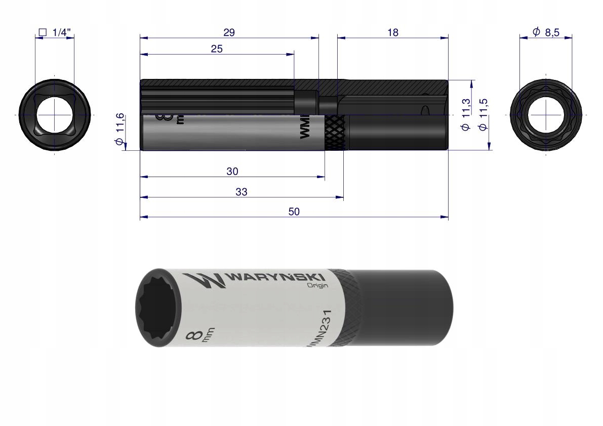 Nasadka dwunastokątna 1/4". 8 mm. długa. CrV50BV30. DIN 3124. Waryński