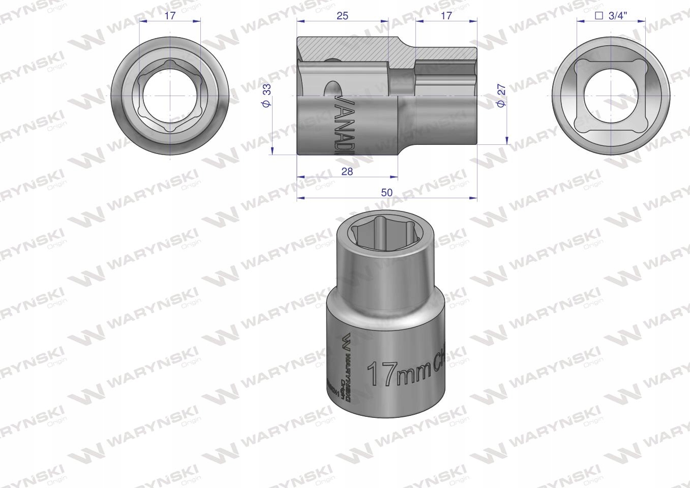 Nasadka sześciokątna 3/4 17 mm WARYŃSKI, WMN241Nasadka sześciokątna 3/4 17 mm WARYŃSKI