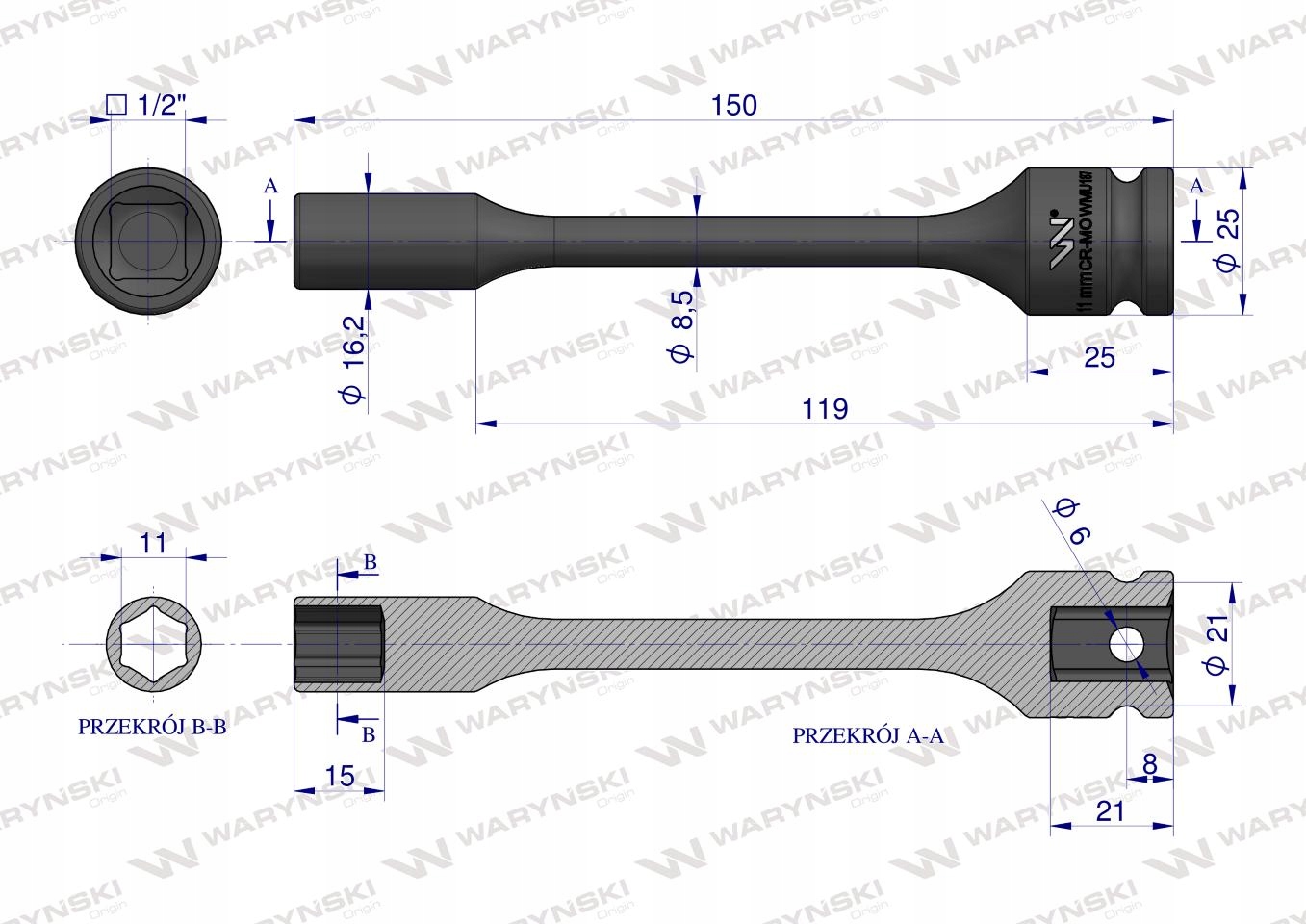 Nasadka udarowa 1/2", sześciokątna slim ze stali CrMo 11mm długość 150 mm, stosowane w mechanice do kluczy udarowych, Waryński [WMU187]