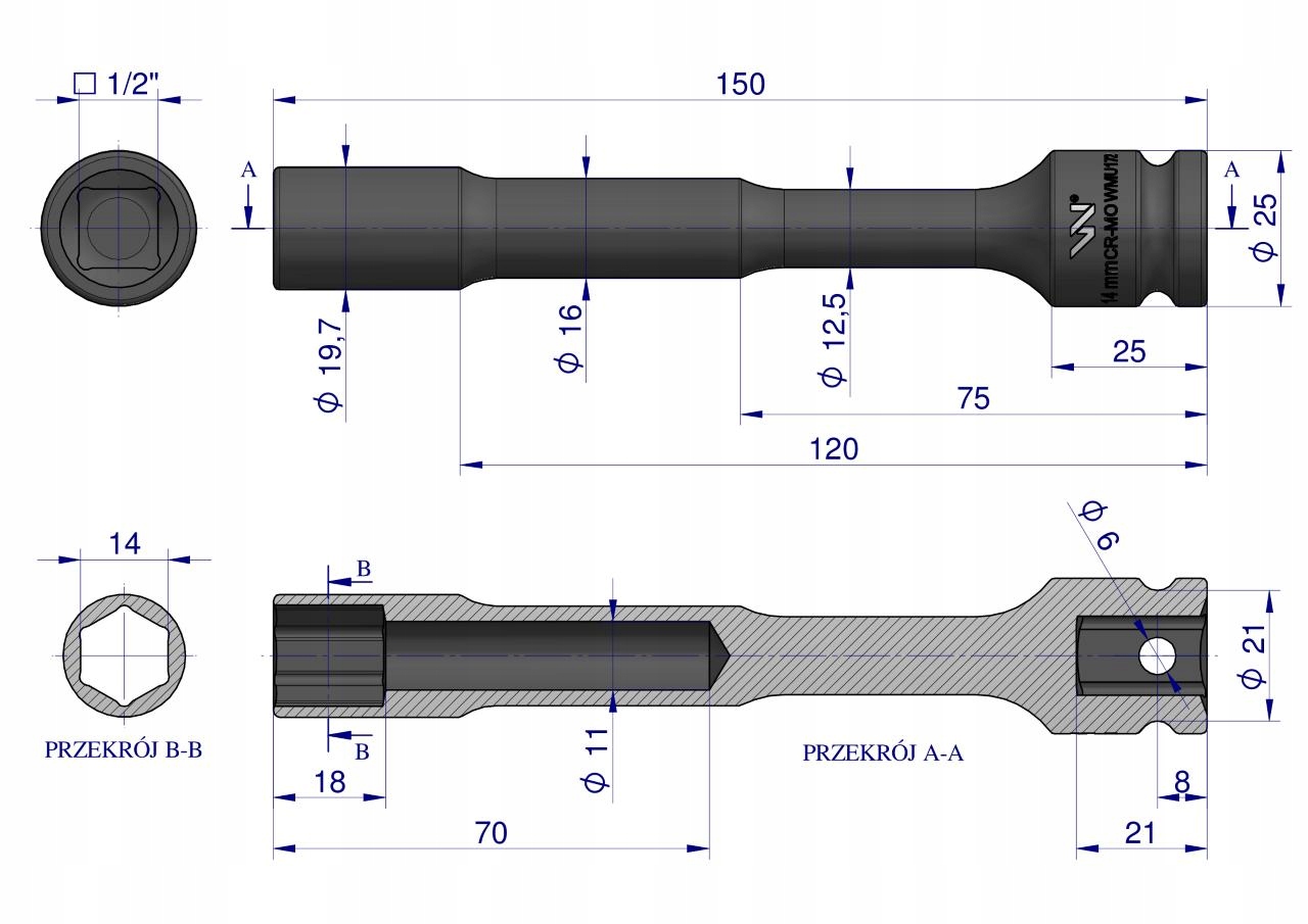 Nasadka udarowa 1/2", sześciokątna slim przelotowa ze stali CrMo 14mm długość 150 mm, stosowane w mechanice do kluczy udarowych, Waryński [WMU172]
