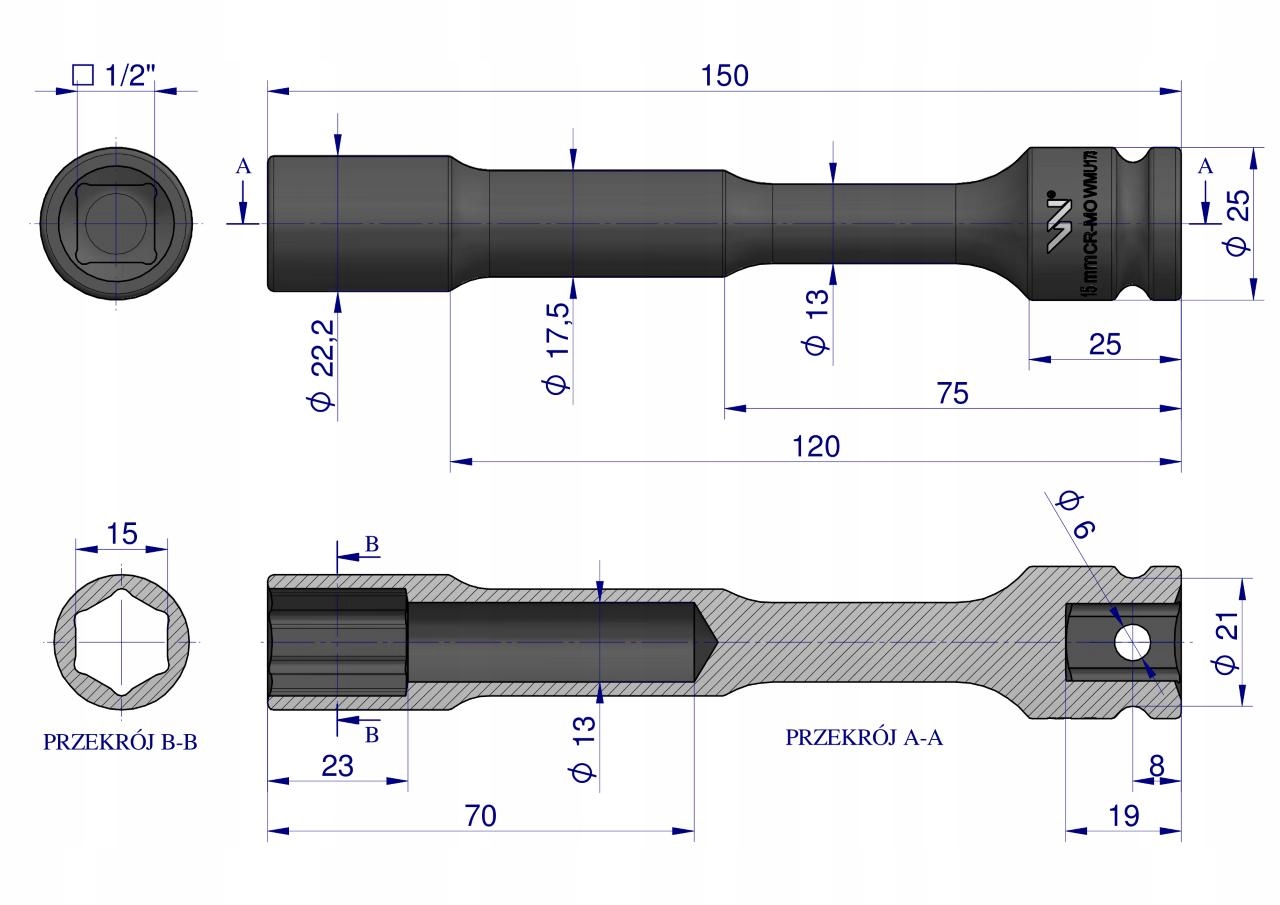 Nasadka udarowa 1/2", sześciokątna slim przelotowa ze stali CrMo 15mm długość 150 mm, stosowane w mechanice do kluczy udarowych, Waryński [WMU173]