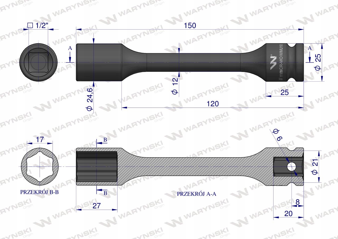 Nasadka udarowa 1/2", sześciokątna slim ze stali CrMo 17mm długość 150 mm, stosowane w mechanice do kluczy udarowych, Waryński [WMU193]