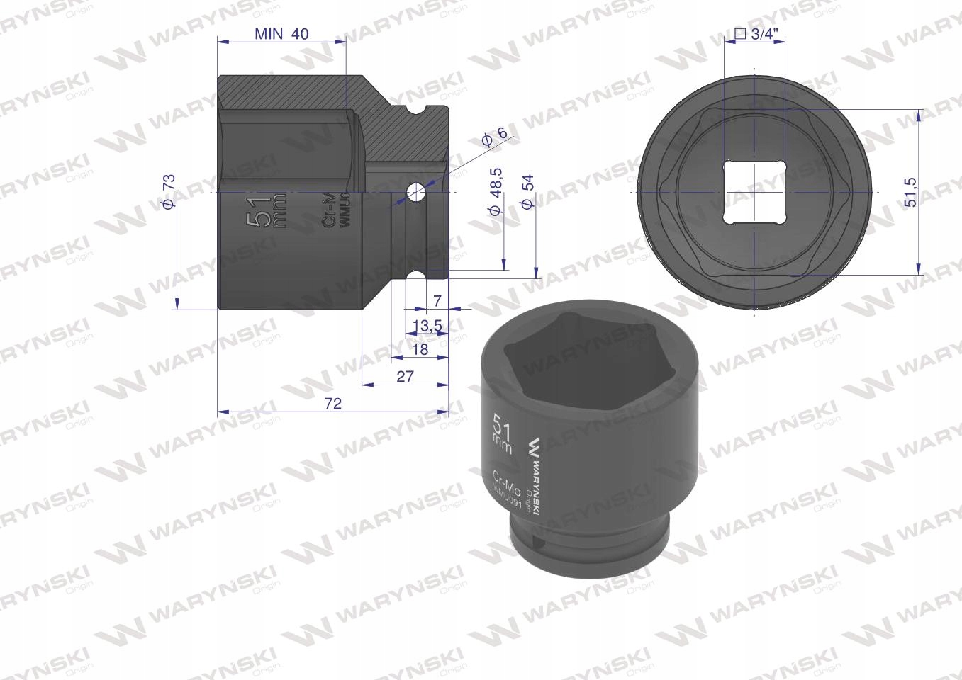 Nasadka udarowa 6-kątna 3/4' 51mm WARYŃSKI, WMU091Nasadka udarowa 6-kątna 3/4' 51mm WARYŃSKINasadka udarowa 6-kątna 3/4' 51mm WARYŃSKINasadka udarowa 6-kątna 3/4' 51mm WARYŃSKI