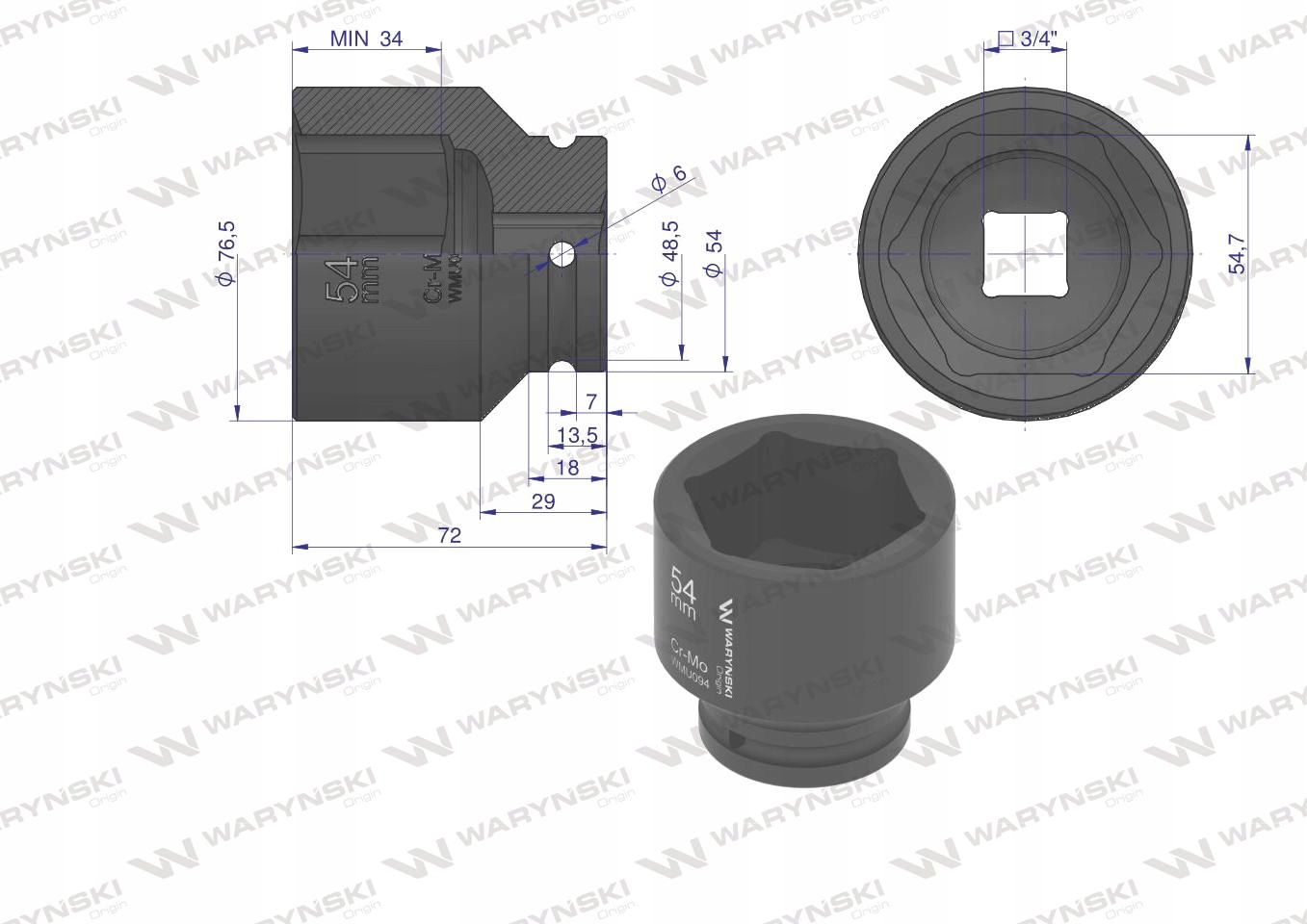 Nasadka udarowa 6-kątna 3/4' 54mm WARYŃSKI, WMU094Nasadka udarowa 6-kątna 3/4' 54mm WARYŃSKINasadka udarowa 6-kątna 3/4' 54mm WARYŃSKINasadka udarowa 6-kątna 3/4' 54mm WARYŃSKI