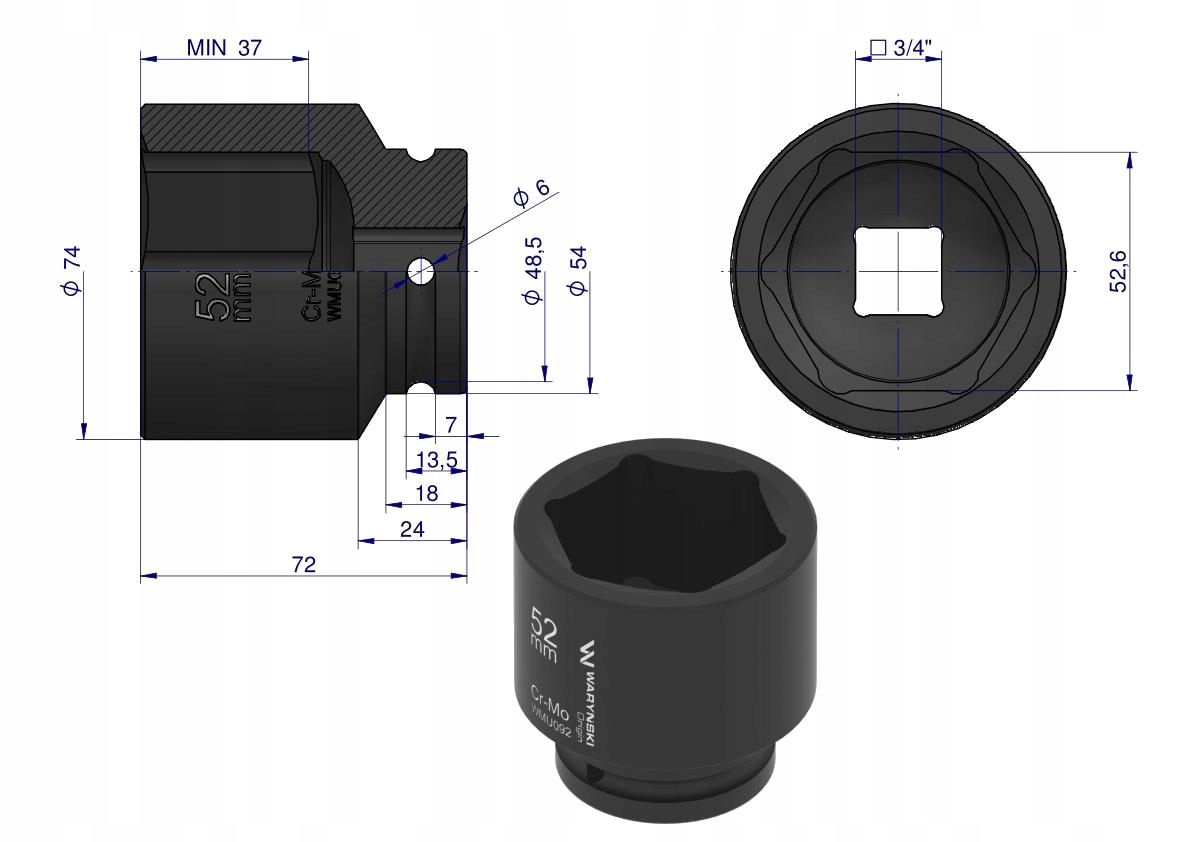 Nasadka udarowa sześciokątna 3/4". 52 mm. CrMo. DIN 3129. Waryński