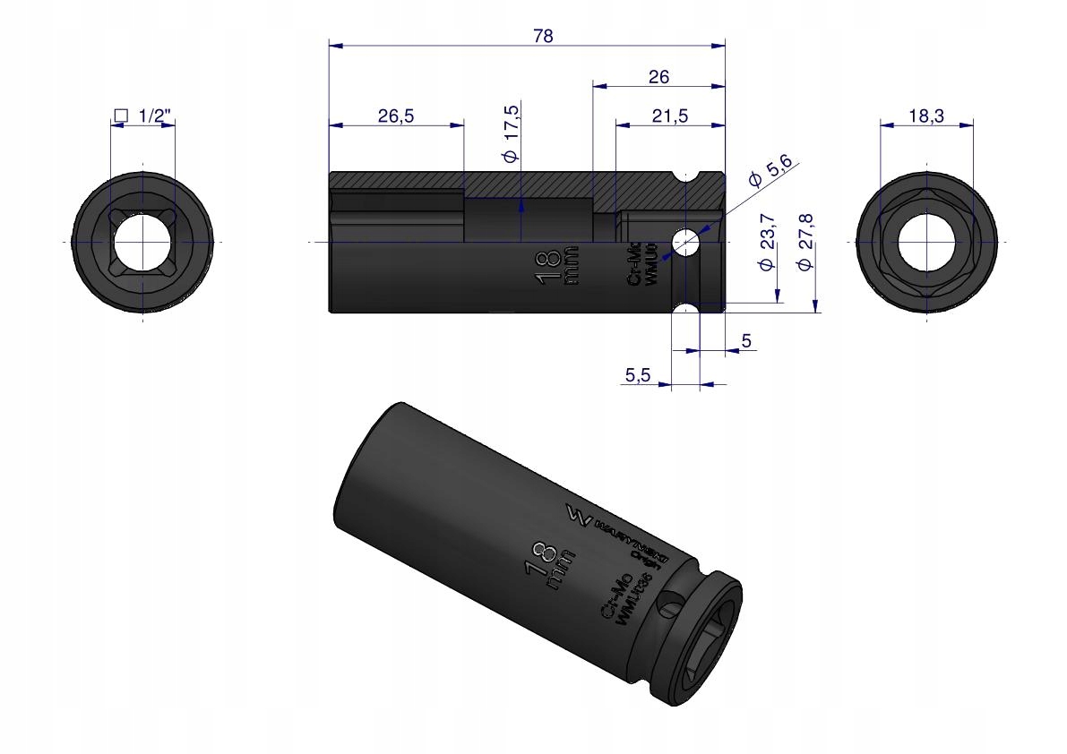 Nasadka udarowa sześciokątna długa 1/2cal 18 mm CrMo DIN 3129 WARYŃSKI, WMU036Nasadka udarowa sześciokątna długa 1/2Nasadka udarowa sześciokątna długa 1/2Nasadka udarowa sześciokątna długa 1/2Nasadka udarowa sześciokątna długa 1/2