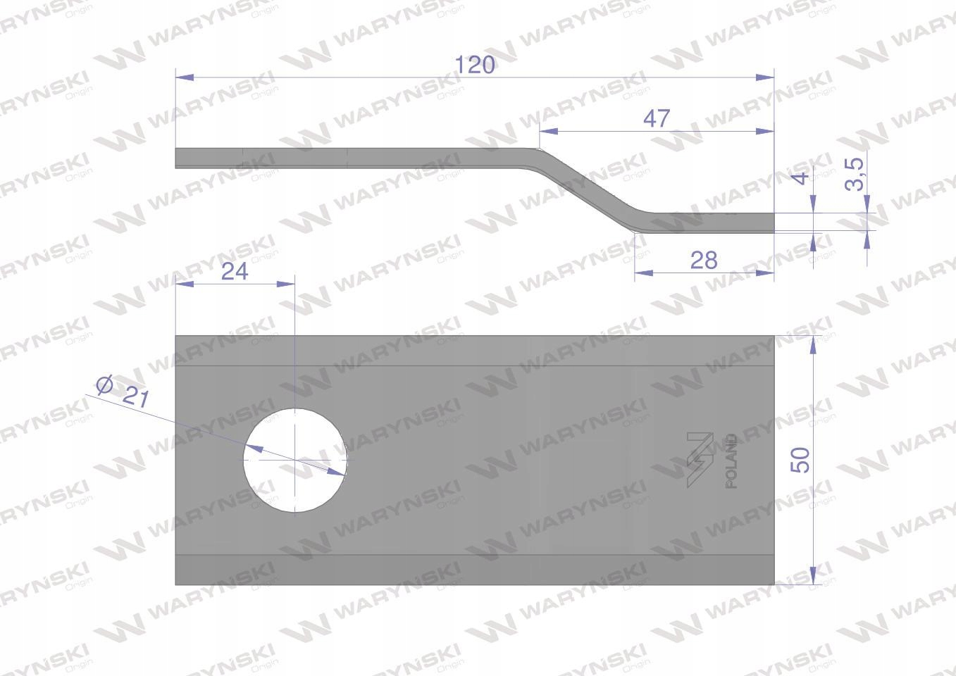 Nóż. nożyk kosiarka gięty 120x50x4mm otwór 21 zastosowanie 434122 Pottinger WARYŃSKI ( sprzedawane po 25 ) [WKR120X50X4]