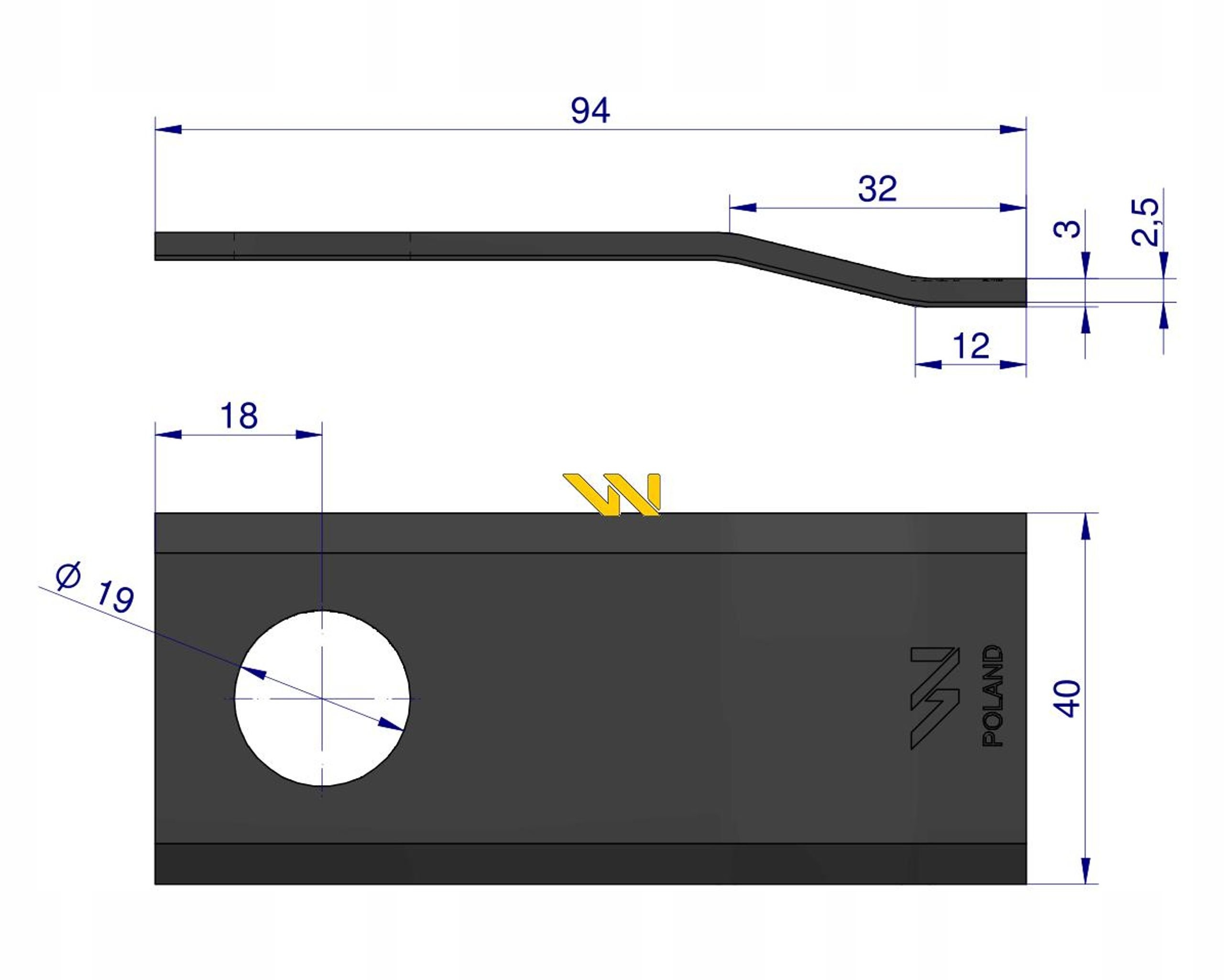 Nóż. nożyk kosiarka gięty 94X40X3mm otwór 19 zastosowanie Deutz Fahr 94/P 1101701015322 WARYŃSKI ( sprzedawane po 25 ) [WKR94X40X3/1]