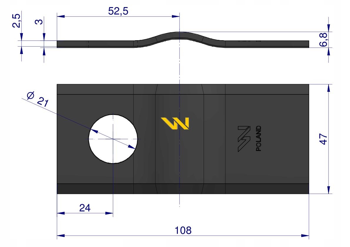 Nóż. nożyk kosiarka gięty 108x46x3mm otwór 21 zastosowanie CM120-108 PZ WARYŃSKI ( sprzedawane po 25 ) [WKR108X46X3/1]