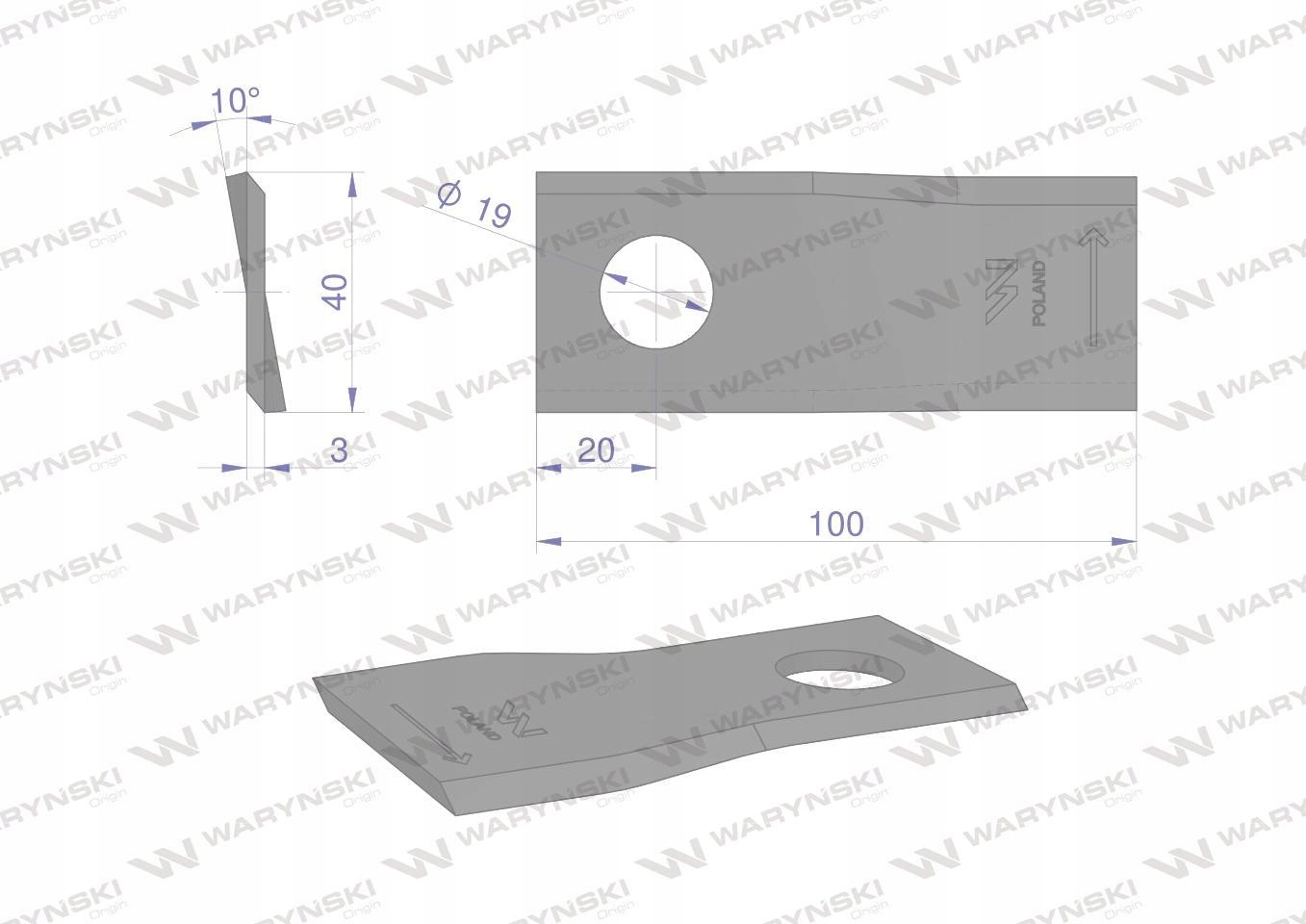 Nóż. nożyk kosiarka lewy 100x40x3mm otwór 19 zastosowanie 580290966 BCS Sipma WARYŃSKI ( sprzedawane po 25 ) [WKR100X40X3L]