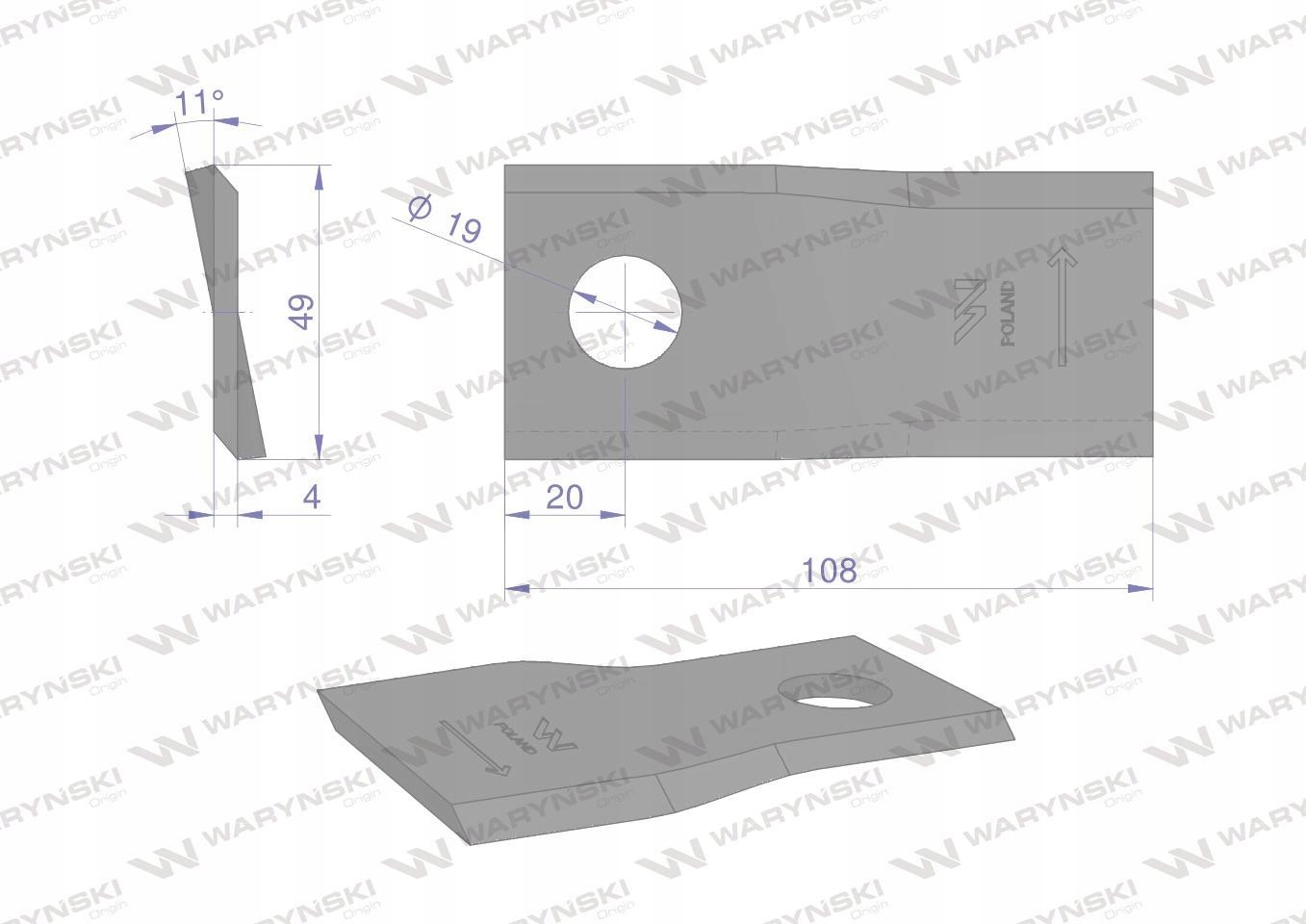 Nóż. nożyk kosiarka lewy 108x47x4mm otwór 19 zastosowanie 1434985 Pottinger WARYŃSKI ( sprzedawane po 25 ) [WKR108X47X4L]