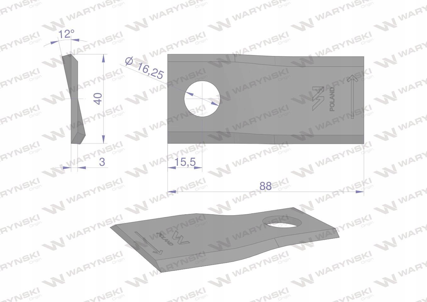 Nóż. nożyk kosiarka lewy 88x40x3mm otwór 16.25 zastosowanie 56151000 Kuhn WARYŃSKI ( sprzedawane po 25 ) [WKR88X40X3L]