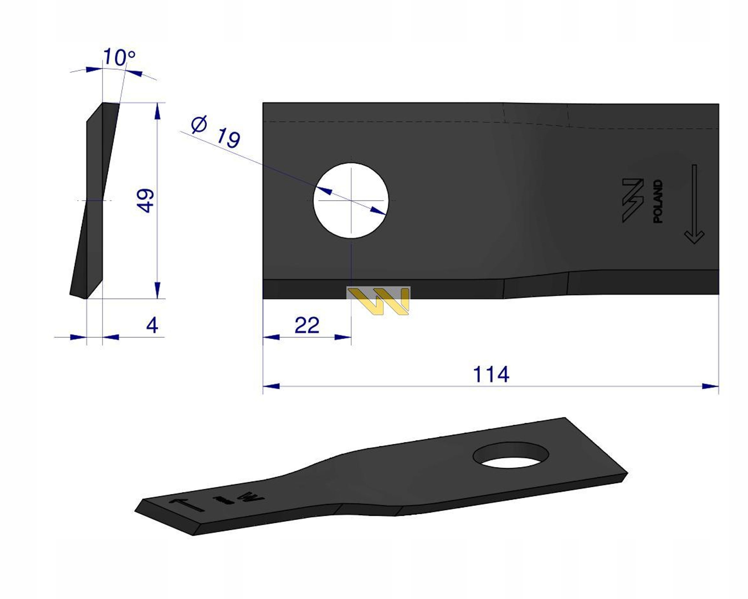 Nóż. nożyk kosiarka prawy 114x48x4mm otwór 19 zastosowanie 13800015 JF-Stoll WARYŃSKI ( sprzedawane po 25 ) [WKR114X48X4P]