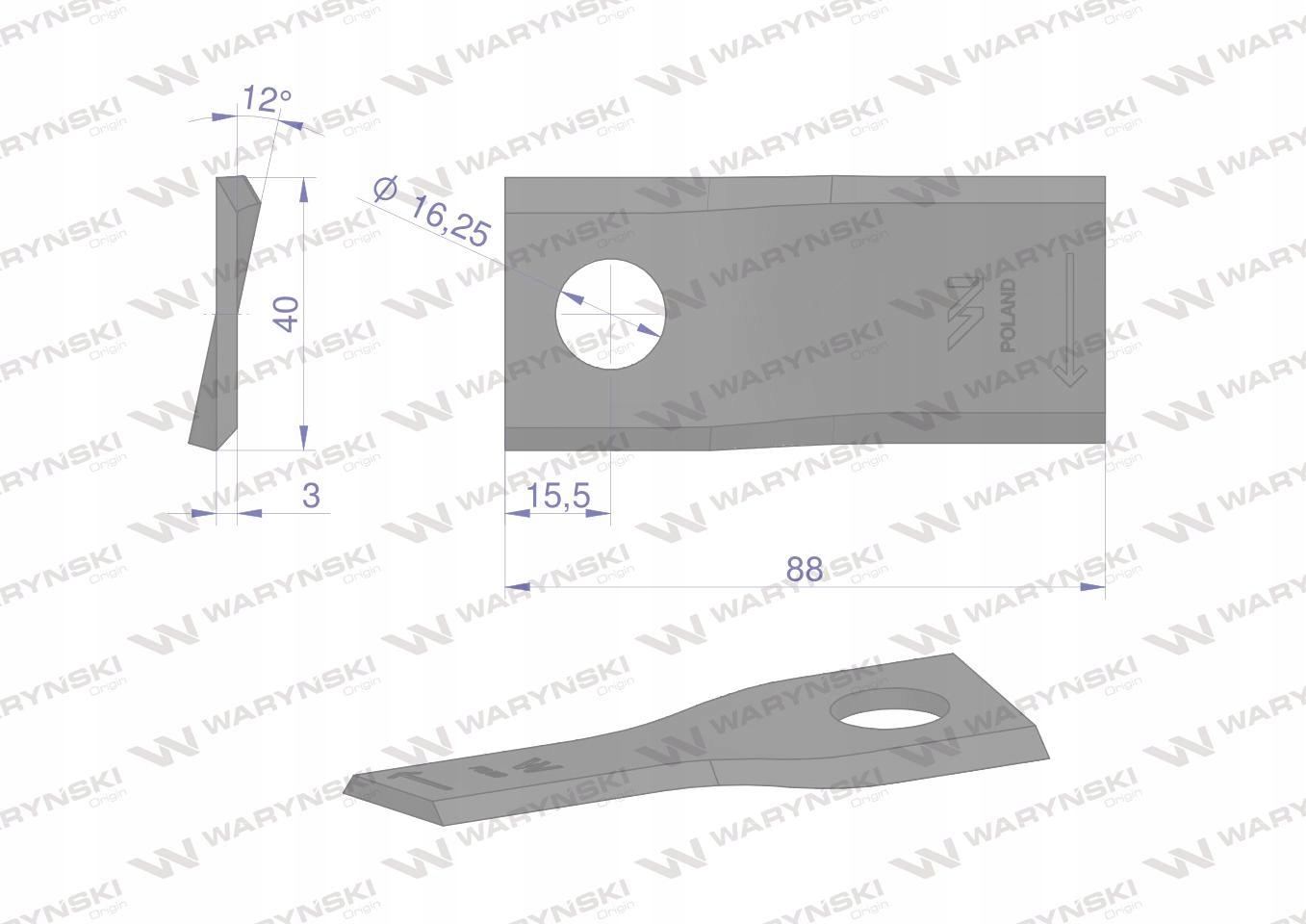 Nóż. nożyk kosiarka prawy 88x40x3mm otwór 16.25 zastosowanie 56151100 Kuhn WARYŃSKI ( sprzedawane po 25 ) [WKR88X40X3P]
