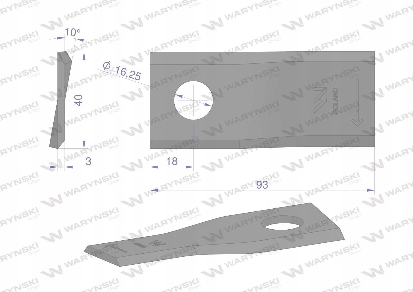 Nóż. nożyk kosiarka prawy 93x40x3mm otwór 16.2 zastosowanie 56151300 Kuhn WARYŃSKI ( sprzedawane po 25 ) [WKR93X40X3P]