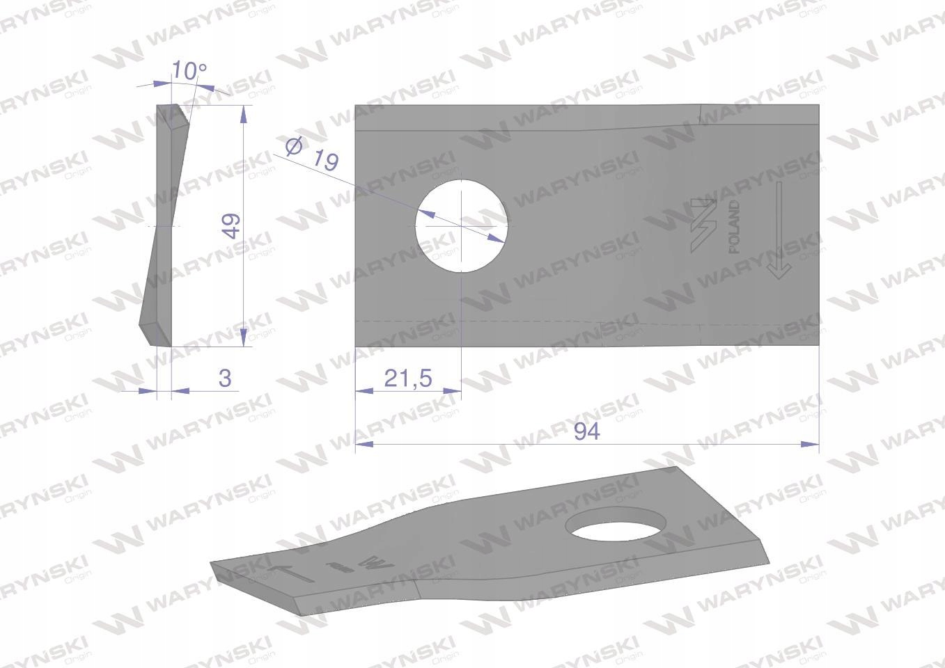 Nóż. nożyk kosiarka prawy 94x48x3mm otwór 19 zastosowanie 570410 Niemeyer Kverneland WARYŃSKI ( sprzedawane po 25 ) [WKR94X48X3P]