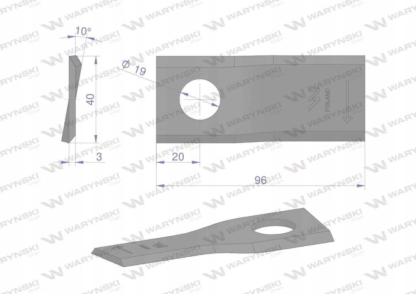 Nóż. nożyk kosiarka prawy 96x40x3mm otwór 19 zastosowanie 16502726 Deutz Fahr Kverneland WARYŃSKI ( sprzedawane po 25 ) [WKR96X40X3P]