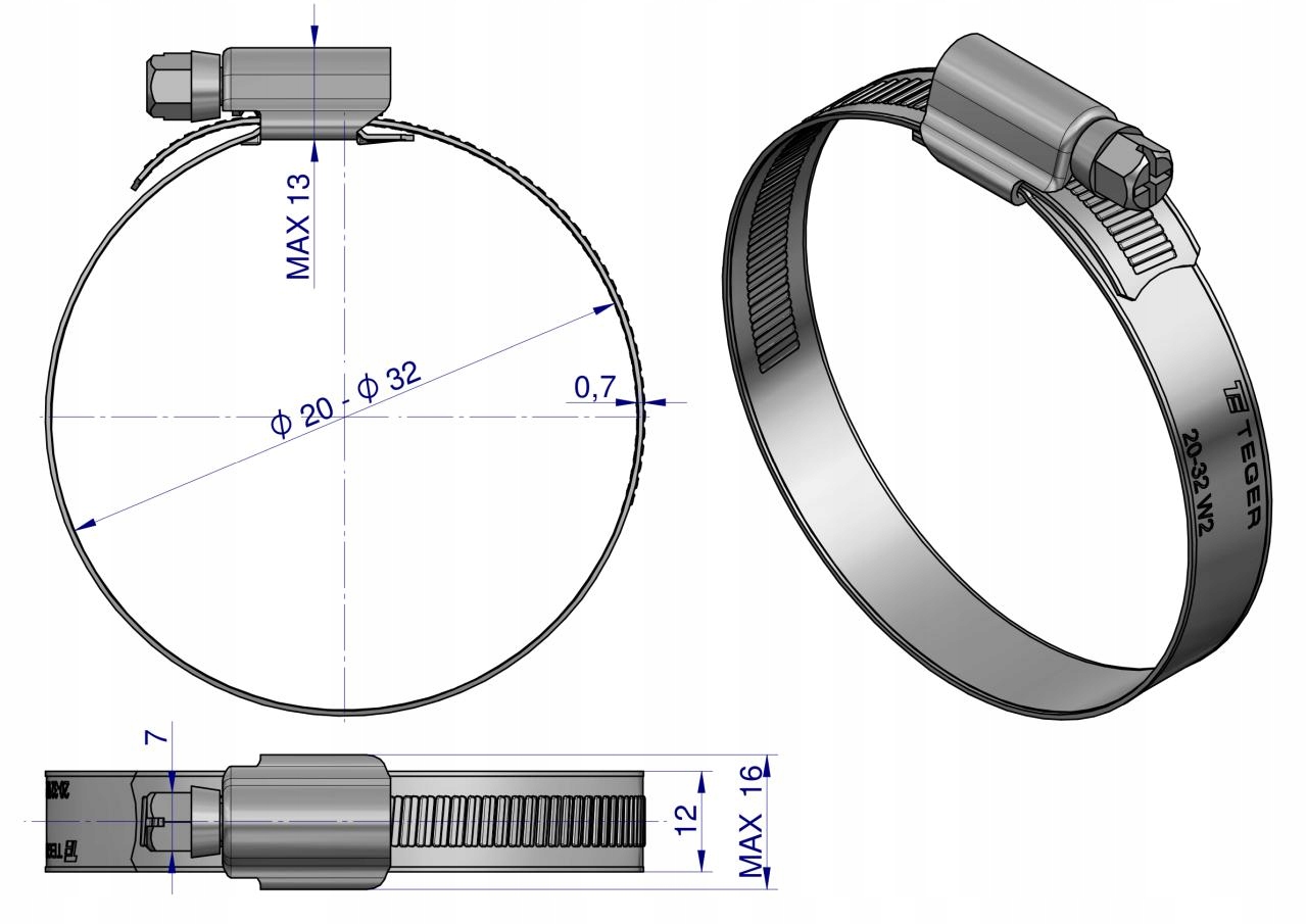 Opaska zaciskowa wzmacniana 20-32 ślimakowa skręcana (obejma W2 - stal nierdzewna) szerokość 12mm TEGER.