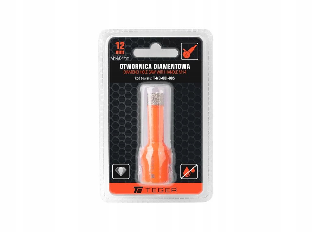 Otwornica diamentowa z uchwytem M14/12 mm / TEGER przeznaczone do wykonywania otworów przy zastosowaniu szlifierki kontowej głównie w twardych materiałach, takich jak: marmur, granit, gres, ceramika, beton, kamień.