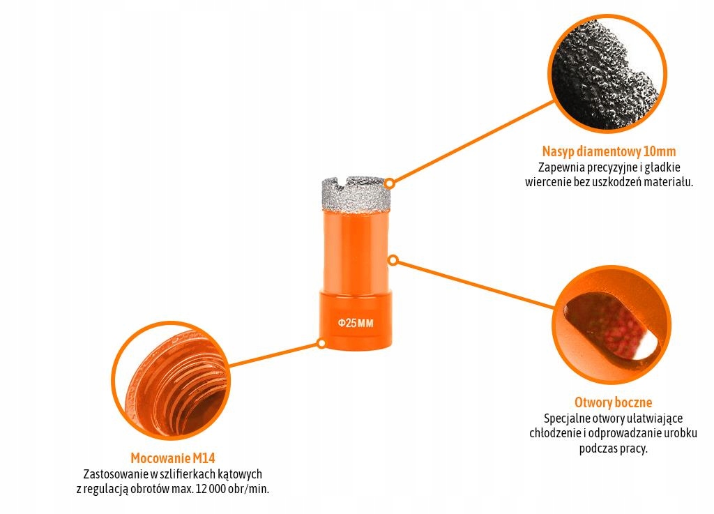 Otwornica diamentowa z uchwytem M14/25 mm / TEGER przeznaczone do wykonywania otworów przy zastosowaniu szlifierki kontowej głównie w twardych materiałach, takich jak: marmur, granit, gres, ceramika, beton, kamień.