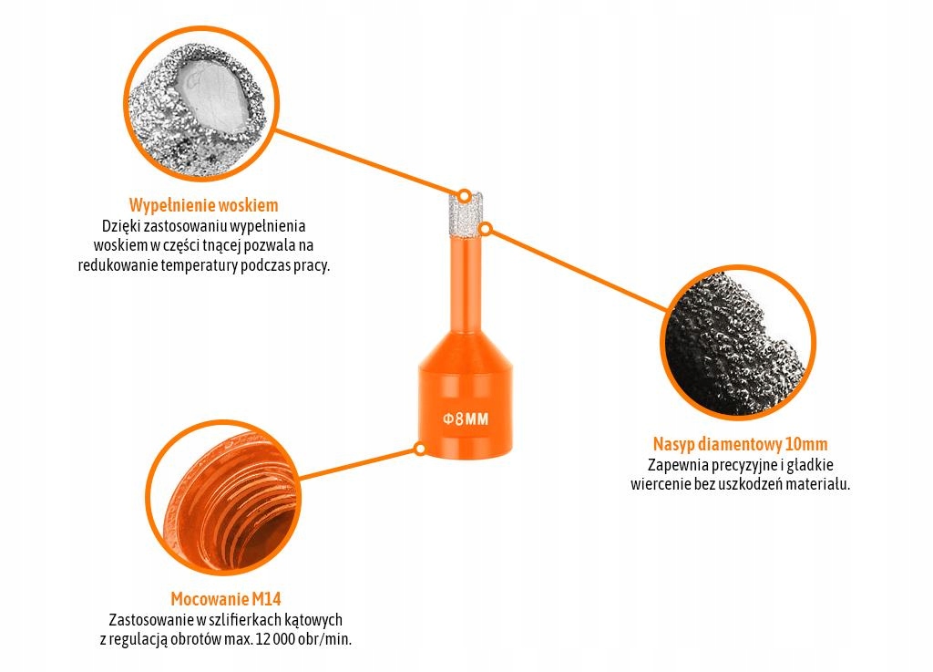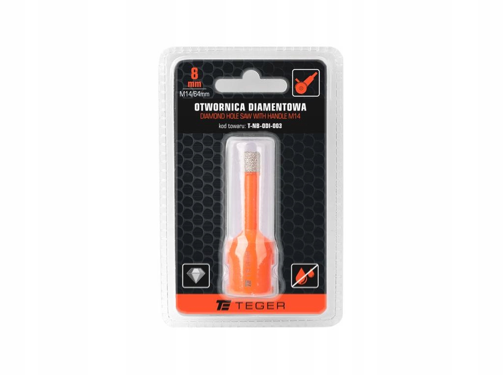Otwornica diamentowa z uchwytem M14/8 mm / TEGER przeznaczone do wykonywania otworów przy zastosowaniu szlifierki kontowej głównie w twardych materiałach, takich jak: marmur, granit, gres, ceramika, beton, kamień.