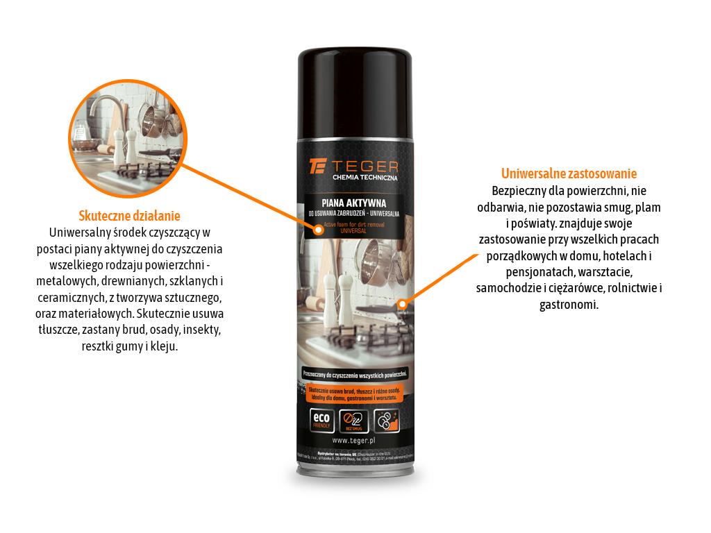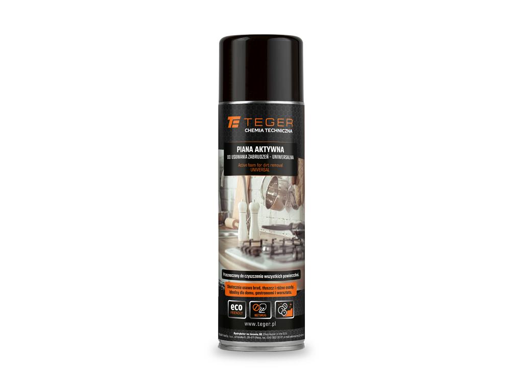 Piana aktywna do usuwania zabrudzeń - uniwersalna 500 ml, TEGER Uniwersalny środek czyszczący w postaci piany aktywnej do czyszczenia wszelkiego rodzaju powierzchni - metalowych, drewnianych, szklanych i ceramicznych, z tworzywa sztucznego, oraz materiałowych. Skutecznie usuwa tłuszcze, zastany brud, osady, insekty, resztki gumy i kleju.