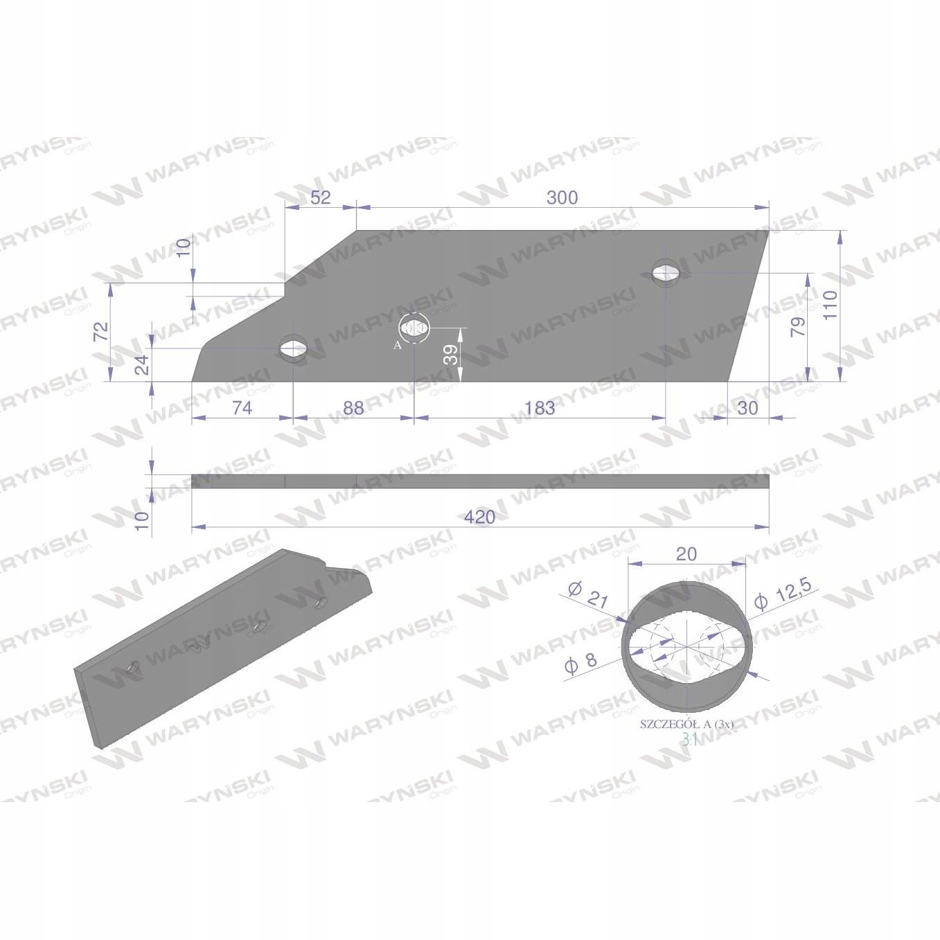 ŚRUBY WSPÓŁPRACUJĄCE:3 x W-173121235Płoza krótka prawa zastosowanie Kuhn stal borowa WARYŃSKI Części robocze marki WARYŃSKI wykonane są z niezwykle wytrzymałej i odpornej na ścieranie stali borowej pochodzącej z europejskich hut. Każda, nawet najmniejsza dostawa, posiada dołączony certyfikat potwierdzający skład materiałowy. Stal borowa posiada właściwości szczególnie przydatne w zastosowaniach konstrukcyjnych wymagających dużej wytrzymałości. Połączenie wysokogatunkowej stali borowej, monitorowanego procesu obróbki cieplnej oraz skrupulatna kontrola jakości produktów WARYŃSKI to gwarancja wydłużonego okresu eksploatacji. Produkty WARYŃSKI to oszczędność kosztów związanych z powolnym ścieraniem i zużyciem części roboczych. W trosce o trwałość naszych produktów oraz zadowolenie klientów proces produkcji lemieszy WARYŃSKI nie zakłada operacji spawania. Wszystkie rodzaje otworów są wykonane w specjalny sposób minimalizujący naprężenia oraz zmniejszający ryzyko pęknięć.