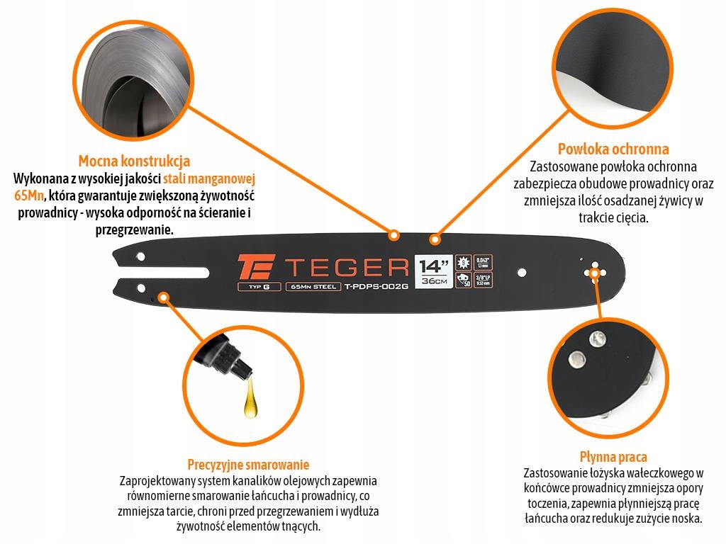 Prowadnica łańcucha do piły 14" (36 cm) / 3/8" 1,1mm 50 og. / 9z / moc. G / TEGER wytrzymała i precyzyjnie wykonana, przeznaczona do pił łańcuchowych, wykorzystywana zarówno przez profesjonalistów, jak i użytkowników domowych. Dzięki wysokiej jakości materiałom i solidnej konstrukcji zapewnia płynną i precyzyjną pracę łańcucha, minimalizując ryzyko przegrzewania oraz nadmiernego zużycia. Przeznaczona do użycia z łańcuchem: T-LDPS-002 TEGER oraz z łańcuchami innych marek które obsługują mocowanie G. Kompatybilna z łańcuchem pełne dłuto i półdłuto.
