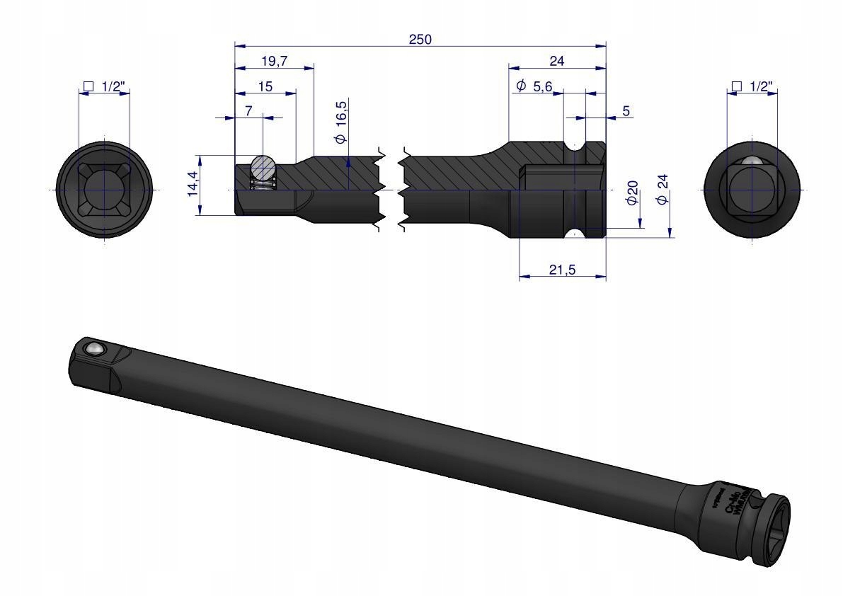Przedłużka do nasadek udarowych 1/2 250mm Waryński, WMU056Przedłużka do nasadek udarowych 1/2 250mm WaryńskiPrzedłużka do nasadek udarowych 1/2 250mm Waryński