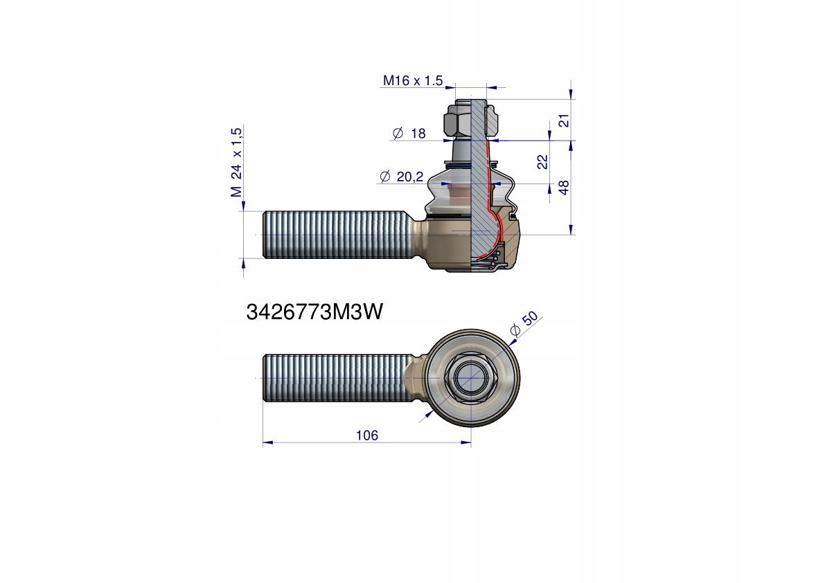 Przegub kierowniczy 106mm- M24x1,5 3426773M3 WARYŃSKI