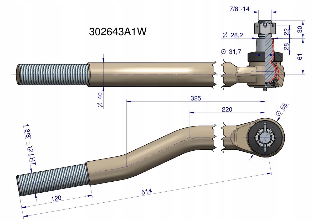 Przegub kierowniczy lewy 514mm- 1 3/8calcal Case 302643A1 WARYŃSKI, 302643A1WPrzegub kierowniczy lewy 514mm- 1 3/8Przegub kierowniczy lewy 514mm- 1 3/8