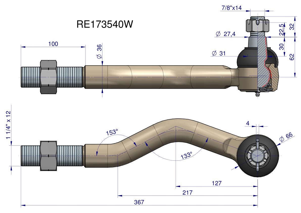 Przegub kierowniczy prawy 367mm - 1 1/4calcal John Deere RE173540 WARYŃSKI, RE173540WPrzegub kierowniczy prawy 367mm - 1 1/4Przegub kierowniczy prawy 367mm - 1 1/4