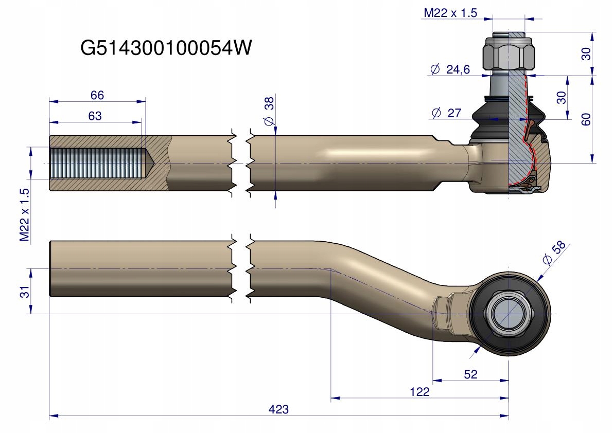 Przegub kierowniczy prawy M22x1.5 Fendt G514300100054 WARYŃSKI, G514300100054W