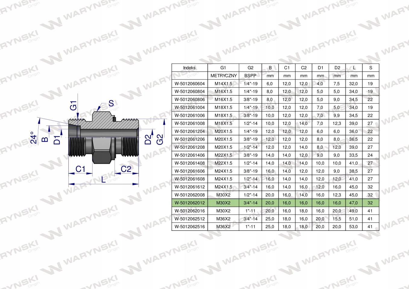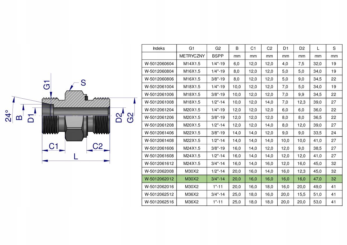 Przyłączka hydrauliczna (odmiana ciężka XGE) BB M30x2 20S x 3/4" BSP ED Waryński. Elementy złączne zostały zaprojektowane i wykonane zgodnie z obowiązującymi normami, które szczegółowo opisują wymagania jakościowe i wymiarowe. Są kompatybilne z elementami złącznymi innych renomowach producentów hydrauliki siłowej.