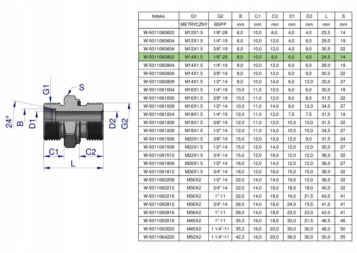 Przyłączka hydrauliczna BB (XGE) M14x1.5 08L x 1/8" BSP ED Waryński. Elementy złączne zostały zaprojektowane i wykonane zgodnie z obowiązującymi normami, które szczegółowo opisują wymagania jakościowe i wymiarowe. Są kompatybilne z elementami złącznymi innych renomowanych producentów hydrauliki siłowej.