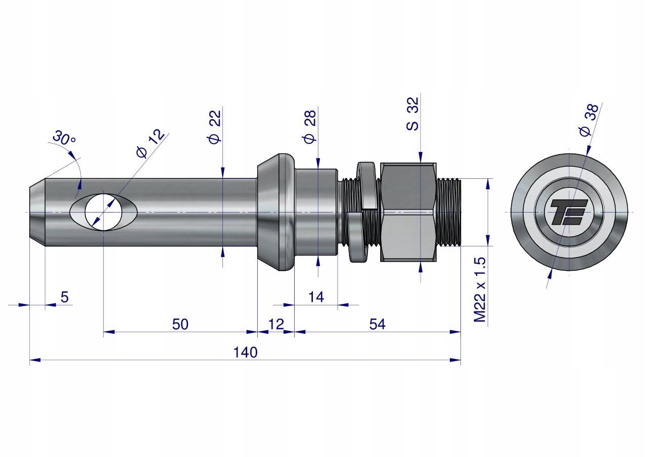 Sworzeń z gwintem T-SG22502240140.1 fi 22/50 mm M22x1.5/40 mm 140 mm TEGER