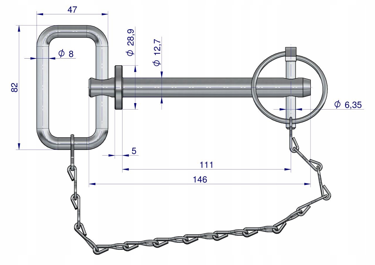 Sworzeń zaczepu z zawleczką i łańcuchem 12.7x111x146 TEGER