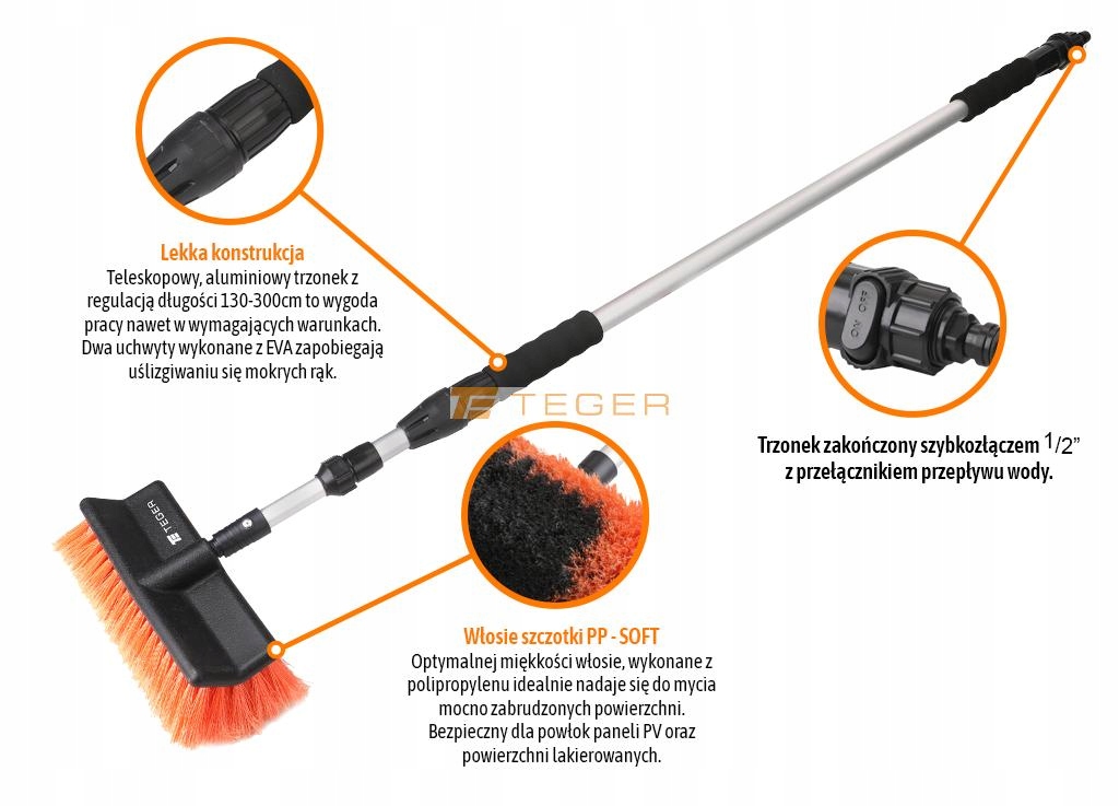 Szczotka teleskopowa - przepływowa (dł. 130-300cm) / włosie PP / TEGER / to idealne narzędzie do: