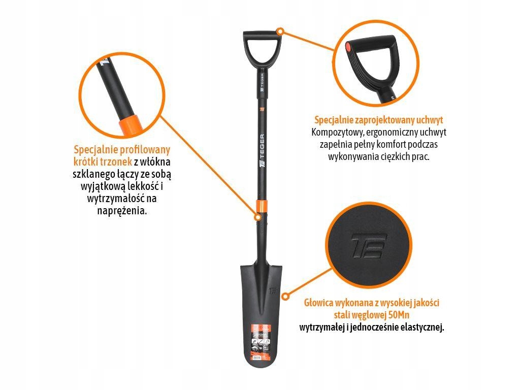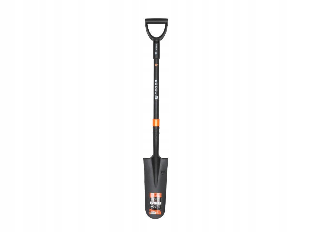 Szpadel drenarski na trzonku z włókna szklanego (dł. 1150 mm), TEGER To solidne narzędzie stworzone do pracy w wymagających warunkach. Wąska, głęboka głowica ze stali węglowo-manganowej 50Mn, poddana obróbce cieplnej, zapewnia wysoką twardość oraz odporność na ścieranie i odkształcenia. Dzięki swojej konstrukcji idealnie sprawdza się przy wykonywaniu wąskich wykopów i rowków, m.in. pod dreny, przewody czy kable. Trzonek z włókna szklanego wyróżnia się lekkością i odpornością na uszkodzenia mechaniczne, wilgoć oraz zmienne warunki atmosferyczne. Dodatkowy pierścień wzmacniający w miejscu łączenia głowicy z trzonkiem podnosi trwałość narzędzia, a ergonomiczny uchwyt ułatwia długotrwałą pracę. Indeks rączki: T-O-RACZ-EXT / T-O-RACZ032C TEGER