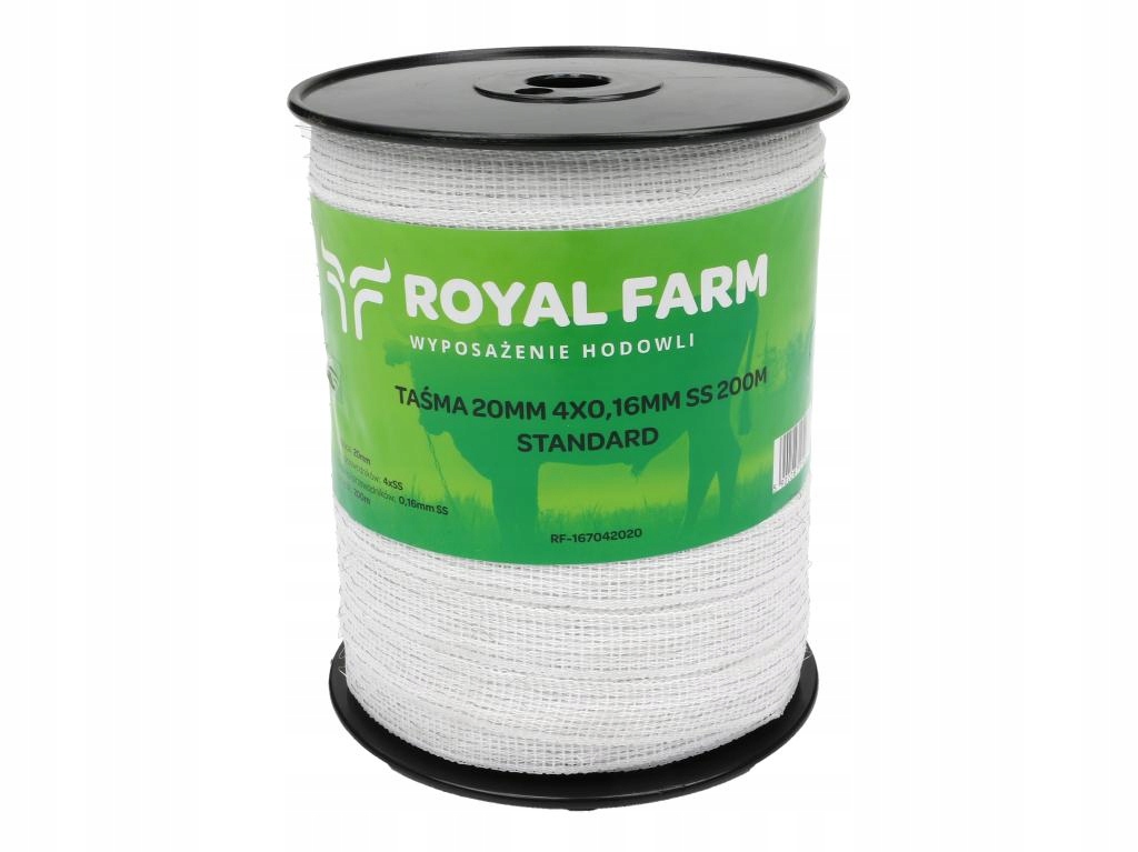 Wytrzymała i wydajna Taśma ogrodzeniowa marki Royal Farm przeznaczona do elektryzatorów. Dzięki zastosowaniu 4 przewodów ze stali nierdzewnej (o średnicy 0,16 mm każdy) zapewnia bardzo dobrą przewodność prądu, co skutecznie zabezpiecza pastwiska i wybiegi.
