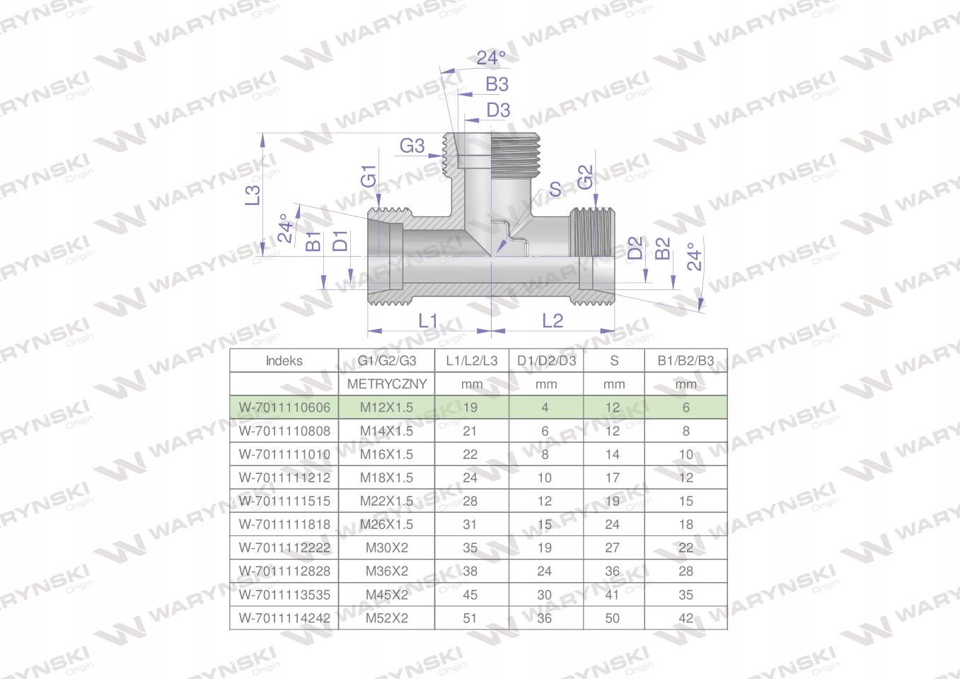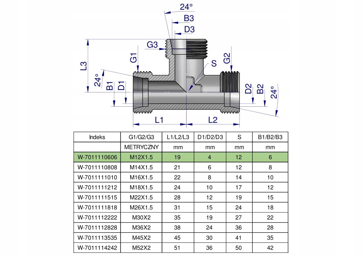 Trójnik hydrauliczny metryczny BBB M12x1.5 06L (XT) Waryński. Elementy złączne zostały zaprojektowane i wykonane zgodnie z obowiązującymi normami, które szczegółowo opisują wymagania jakościowe i wymiarowe. Są kompatybilne z elementami złącznymi innych renomowach producentów hydrauliki siłowej.